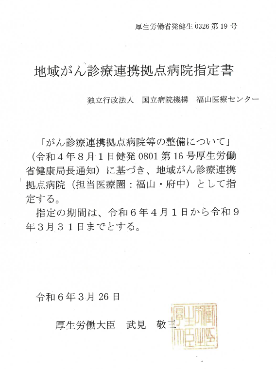 福山医療センターは、国指定の地域がん診療連携拠点病院です。