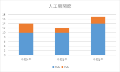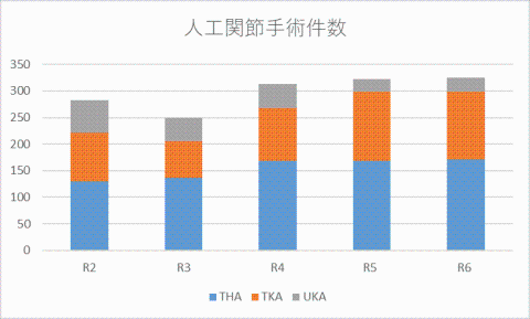 人工股関節置換術(THA)と全人工膝関節置換術(TKA)、単顆人工膝関節置換術(UKA)などを合計した総人工関節置換術の10年間の手術件数は、H19年の93件から昨年の325件と、約3.5倍に増加しました。